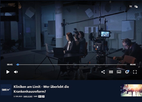 Die 45-minütige Reportage ist am 17. September dieses Jahres im SWR erschienen und in der Mediathek abrufbar. Tatjana Mischke hat zur Krankenhausreform umfassend recherchiert und stellt sie differenziert und faktenbezogen auf allen Ebenen – Politik, Kliniken und Patienten allgemeinverständlich dar. Auf Patientenebene beschreibt sie konkrete Fälle, auf die die Reform unmittelbare Auswirkungen hat und unternimmt mit einem Ärzteteam sogar eine simulierte Notfallanfahrt zu einer Klinik. Die Redakteurin konnte relevante Entscheidungsträgerinnen und -träger, sowohl von Seiten der Ärzteschaft und Kliniklandschaft als auch aus der Politik, als Interviewpartner gewinnen, wodurch die Zuschauenden Einblicke zum Thema aus verschiedenen Perspektiven bekommen können.